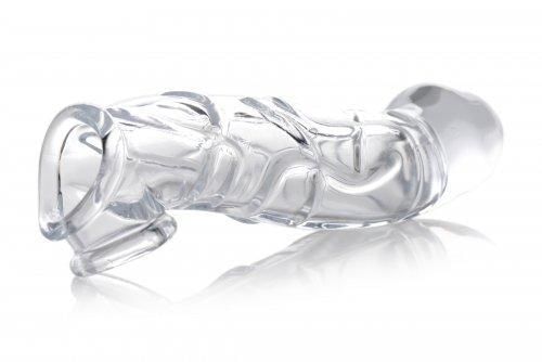 This extender sleeve gives you two whole inches of solid penis to plow into your partner! The realistic texture, featuring a bulbous head and bulging veins, along with a subtle curved shape will deliver a new kind of internal massage. Just lube up and put your entire package through the first hole, allowing your scrotum to go through the bottom hole for a satisfying stretch. The solid 2 inches tip is followed by a hollow interior that allows for a snug and secure fit. This body safe and phthalate free material is compatible with silicone and water based lubricants. Use warm water and mild soap or a toy cleaner to clean after use. Measurements 9 inches in total length, 6.25 inches insertable. Interior diameter is 1.2 inches, exterior diameter is 2 inches. Penis and scrotum hole is 1.5 inches in diameter, scrotum hole is 1 inch in diameter. Materials Thermoplastic Rubber TPR. Color Beige.
